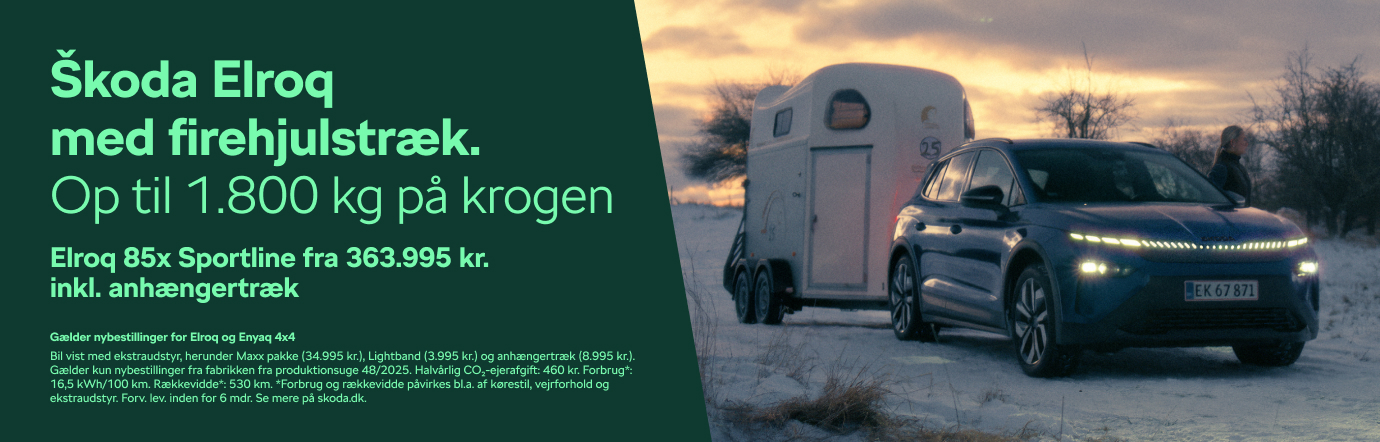 Kombinér rendyrket elektrisk power med firehjulstræk og høj trækkapacitet på op til 1.800 kg (for biler produceret fra uge 48/2025). Elroq er vores mindre SUV, der er nem i hverdagen, men stærk nok til hestetrailer eller campingvogn, når weekenden kalder. Enyaq er den større, rummelige model med ekstra plads til familie, udstyr og bagage. Læs mere om de forskellige varianter herunder, og find den model, der passer bedst til dit behov.